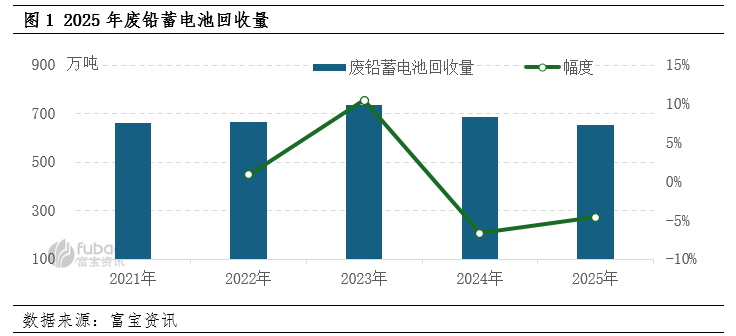 2025年电池二级替换市场整体表现一般,替换出的废旧电池数量减少。据富宝资讯调研统计数据显示,2025年国内合规持证企业废铅酸蓄电池回收总量约655.18万吨,较前一年减少约31.67万吨,减幅4.61%。